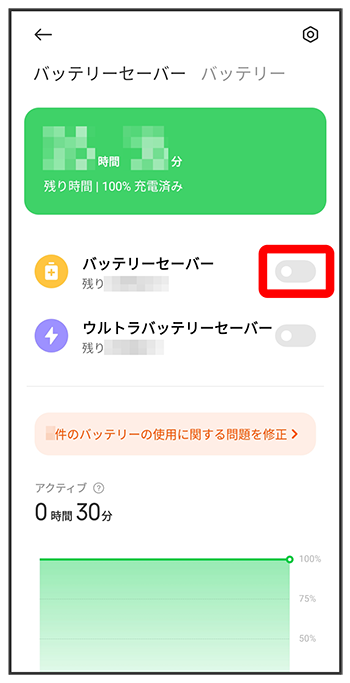 と操作しても、バッテリーセーバーを利用できます。 - バッテリーセーバーを有効にすると、電池アイコンの色が変わります。