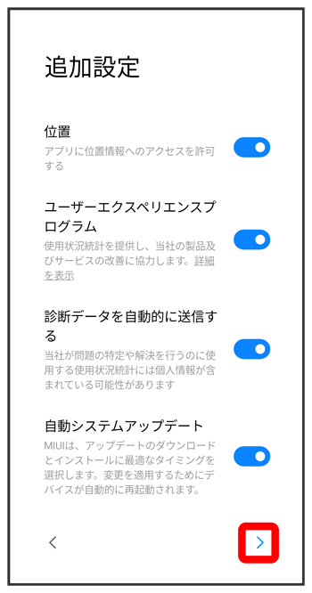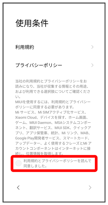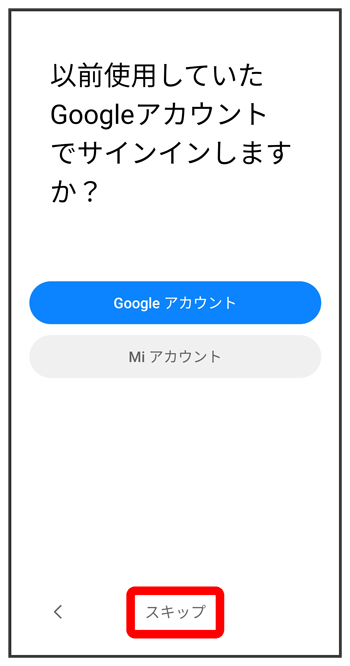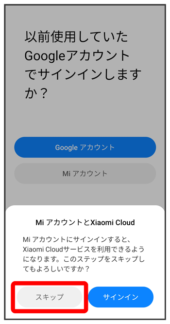 - 以前使用していたGoogle アカウントまたはMi アカウントでログインする場合は、/をタップし、画面の指示に従って操作してください。
