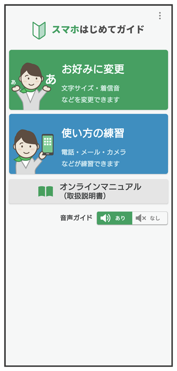 スマホはじめてガイドは、スマホでよく使う機能の練習や、基本的な設定をかんたんに行うことができます。