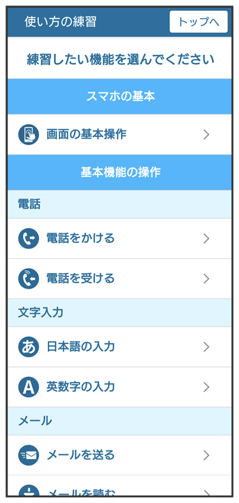 「使い方の練習」では、スマホでよく使う基本的な機能を、実際の画面で練習することができます。