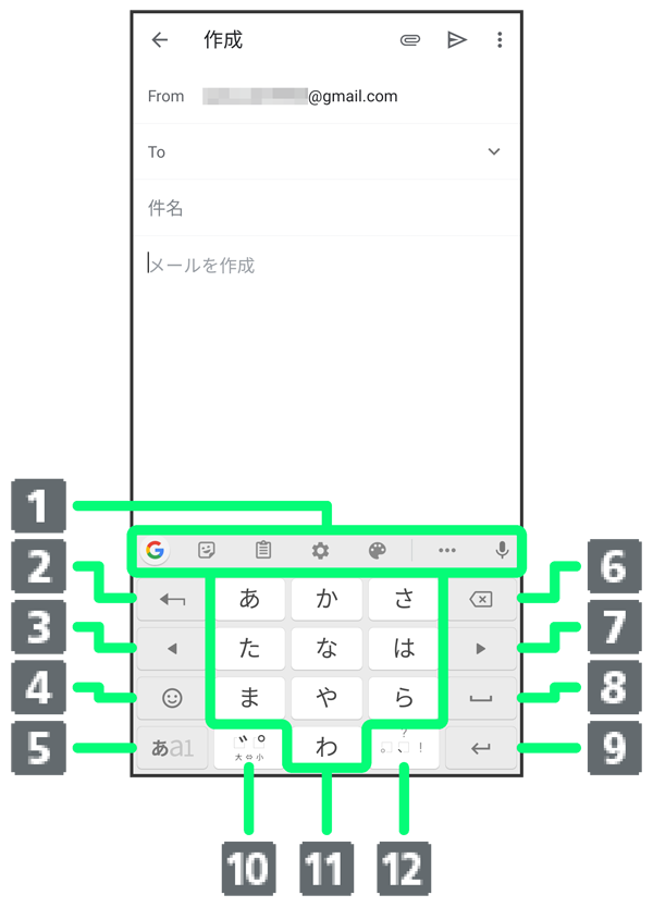 - 文字入力モードを切り替えます(ひらがな/半角英字/数字)。ロングタッチすると入力オプションが表示されます。