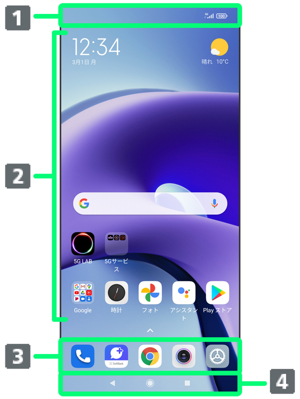 | カスタマイズエリア | アプリのショートカットやフォルダ、ウィジェットを自由に配置できます。 |