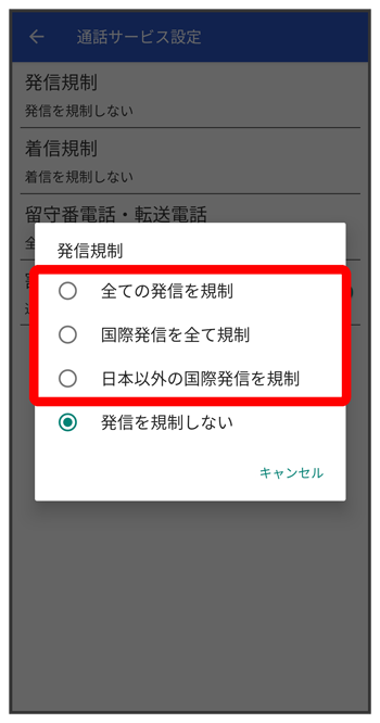 - 発着信規制中に電話をかけようとすると、発信できない旨のメッセージが表示されます。お客様がご利用になる地域によっては、表示されるまでに時間がかかることがあります。
