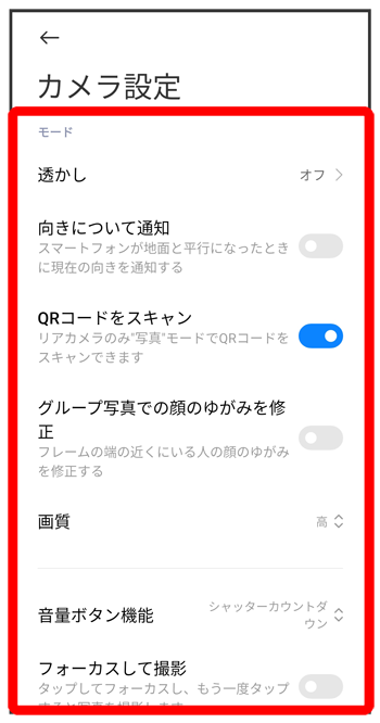 | QRコードをスキャン | 写真撮影画面でQRコードを読み取るかどうかを設定します。 |