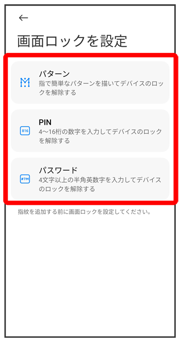 画面の指示に従って画面ロック解除用のパターン/PIN/パスワードを設定