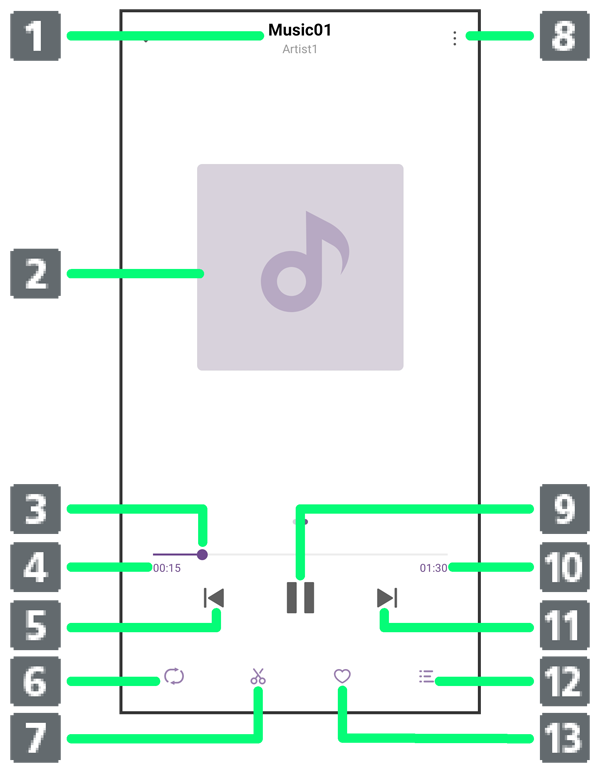 タップすると、1曲リピート/シャッフル/全曲リピートを切り替えできます。 - 着信音エディター