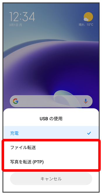 | 写真を転送(PTP) | 本機に保存されている画像ファイル(写真、動画)を、パソコンとやりとりできます。 |