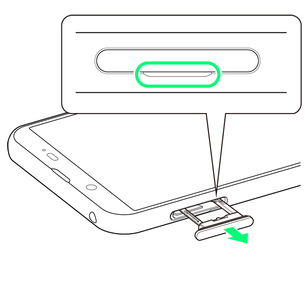 - ディスプレイを上にして、カードトレイを引き出してください。ディスプレイを下にしたり、本機を立てた状態でカードトレイを引き出すと、SIMカードやSDカードがカードトレイから外れ、紛失する可能性があります。