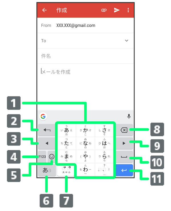 - 文字種(文字入力モード)を切り替え(ロングタッチで、文字入力の設定画面を表示/片手モード)