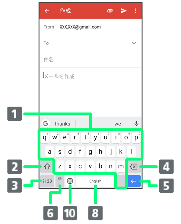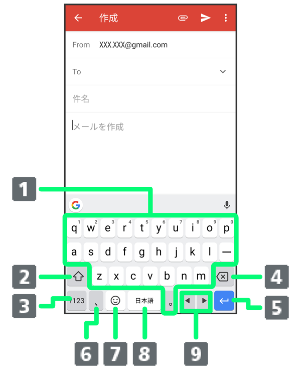 - 読点入力(ロングタッチで、文字入力の設定画面を表示/顔文字/絵文字キーボード(英字入力時)に切り替え/片手モード)