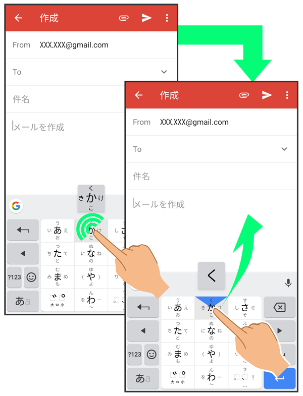 キーを上下左右にフリックすることで、キーを繰り返しタップすることなく、入力したい文字を入力できます。キーをロングタッチすると、キー入力ガイドが表示されます。入力したい文字が表示されている方向にフリックすると、文字が入力されます。