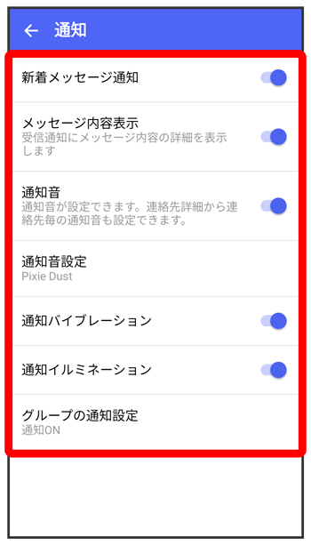 | 通知イルミネーション | メッセージを受信したときに本体のLEDを点灯するかどうかを設定します。 |