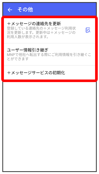 | +メッセージサービスの初期化 | 本体およびサーバー上にあるデータを削除できます。 |