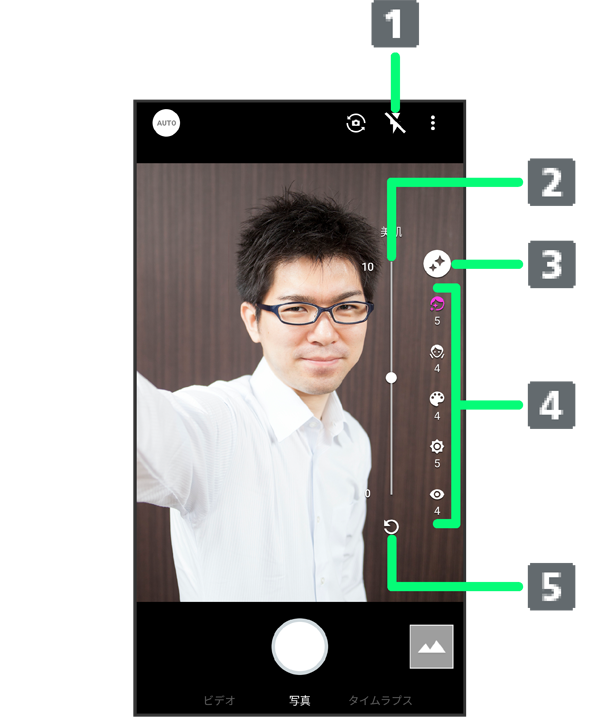 フラッシュの代わりに画面全体が発光し、夜の自撮りでも人物が明るく撮れます。 - 調節バー1