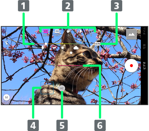 ホワイトバランスやISO感度などの設定ができます。 - オートアイコン