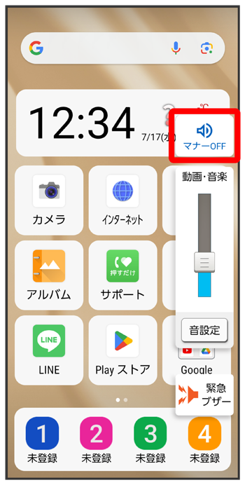 マナーモード設定中に、画面点灯時に本機側面の- 画面点灯時に、ステータスバーを下にフリックしてクイック設定パネルを開く(表示)と操作しても、マナーモードを解除できます。