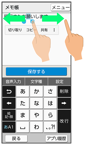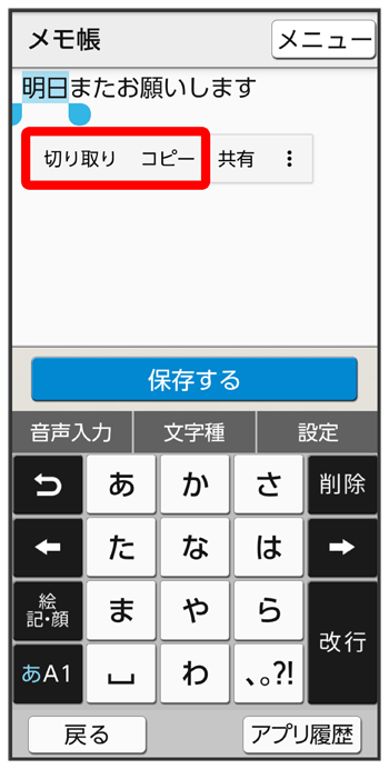 文字入力画面で入力済みの文字列をロングタッチ共有方法をタップ画面に従って操作