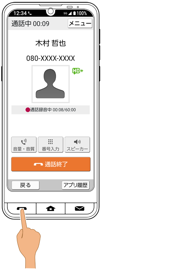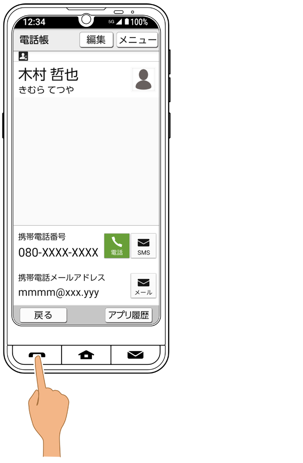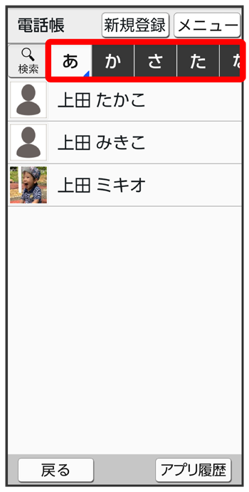 - 選択中の索引を再度タップすると、行内の文字(「あ行」のときは「あいうえお」)が表示されます。隠れている電話帳がある場合、文字をタップすると、その文字から始まる読みの電話帳が表示されます。