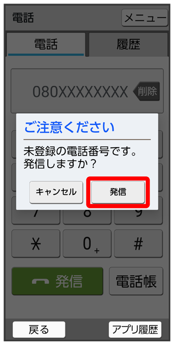 電話番号発信画面や発着信履歴画面から発信したい相手の電話番号を入力