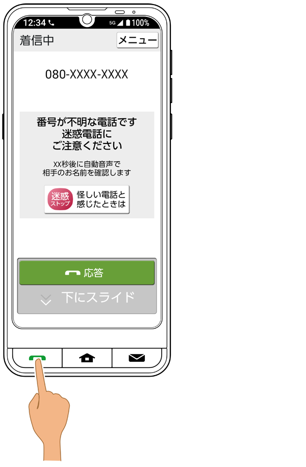 電話帳に登録していない電話番号や、不明な電話から電話がかかってきたときも、電話を受けることができます。このときの相手との通話は、自動的に録音されます。