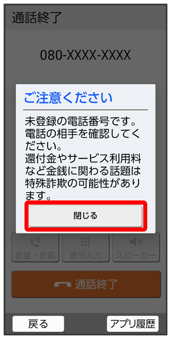 - 相手の電話番号によっては、「ご注意ください」画面が表示されないことがあります。