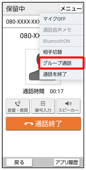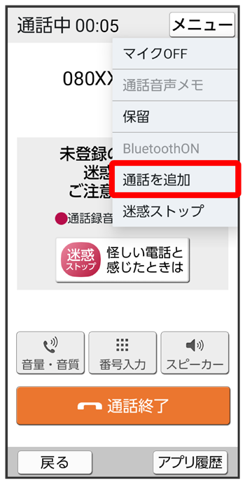 - 電話番号発信画面の通話を追加する履歴をタップしても、通話を追加できます。