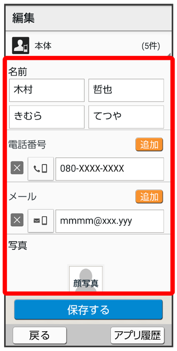 連絡先編集画面で、追加する項目の電話番号などを入力入力した電話番号などを削除する