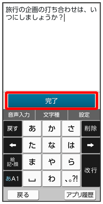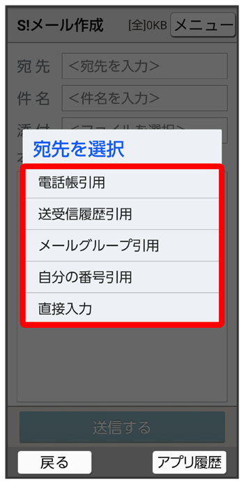 - /をタップすると、電話帳/送信履歴/受信履歴から宛先を選択できます。