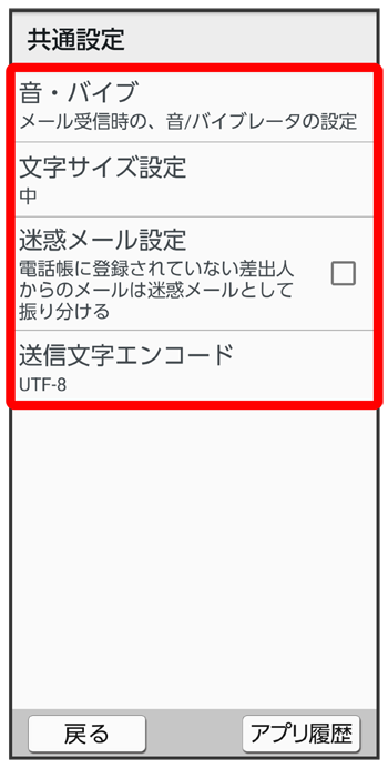 | 音・バイブ | 新着メール受信時の着信音やバイブレータを設定します。 |