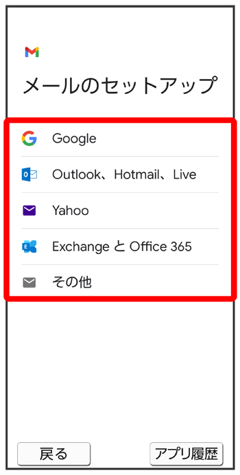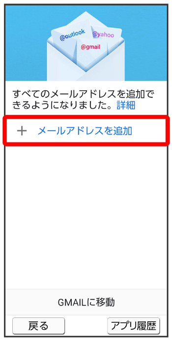 (Gmail)を起動すると、アカウント設定画面が表示され、設定操作を行うことができます。