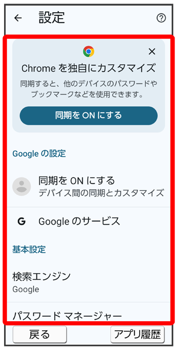 | 同期を ON にする | Google アカウントでログインして、ブックマークや履歴などの設定を利用できます。ログインすると、アカウント情報が表示されます。 |