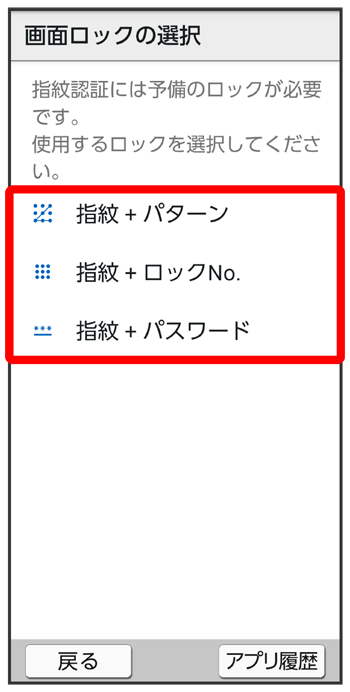- 指紋認証ができないときの予備の画面ロック解除方法になります。