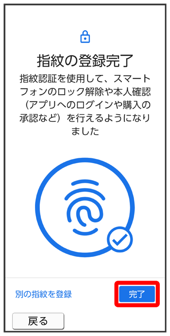 - 指紋の登録完了画面が表示されるまで繰り返してください。