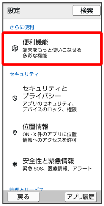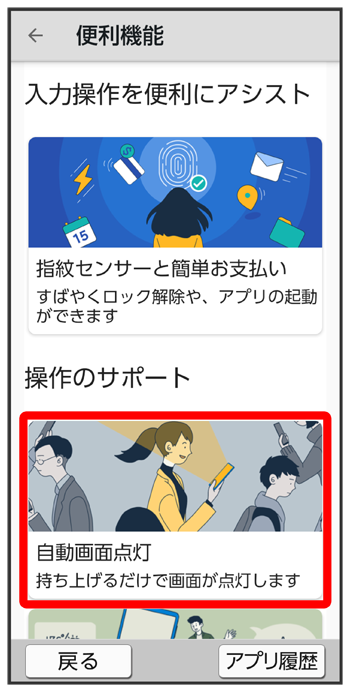 端末を持つだけで画面が点灯したり、画面の点灯をキープしたりするように設定できます。設定できる項目は次のとおりです。