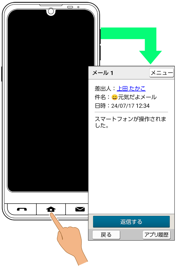 1日の最初に、ボタンを押して画面を点灯させると、自動的に送信相手へ定型文のメールが送信されます。