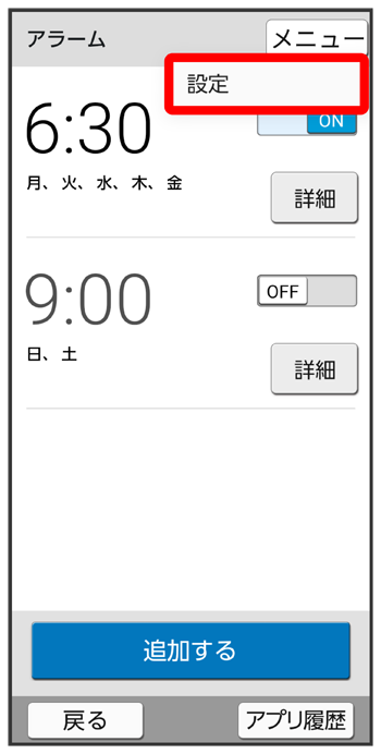| 徐々に音量を上げる | アラームの音量を上げる間隔を設定します。 |