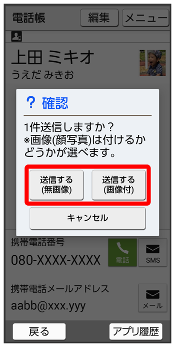 電話帳画面で送信したい連絡先をタップ(