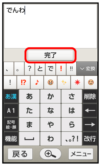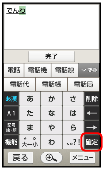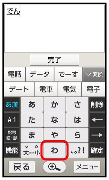 文字入力画面で(4回:て)(1回:て→で)(3回:ん)(1回:わ)