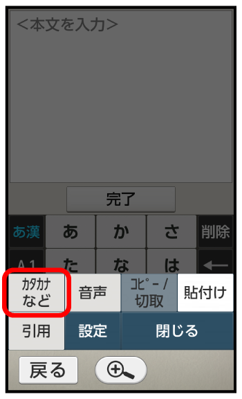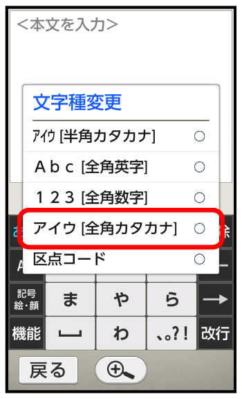 - 全角カタカナ入力モードでの入力例です。ひらがな入力モードの変換候補からも入力できます。