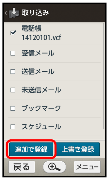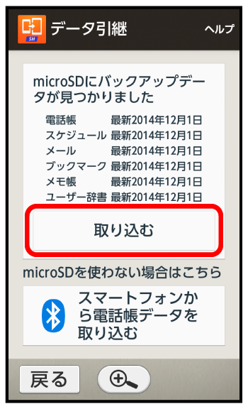 他の機器や本機で保存したデータ(電話帳、メール、ブックマーク、スケジュール、メモ帳、ユーザー辞書/学習辞書)を、本機に取り込むことができます。