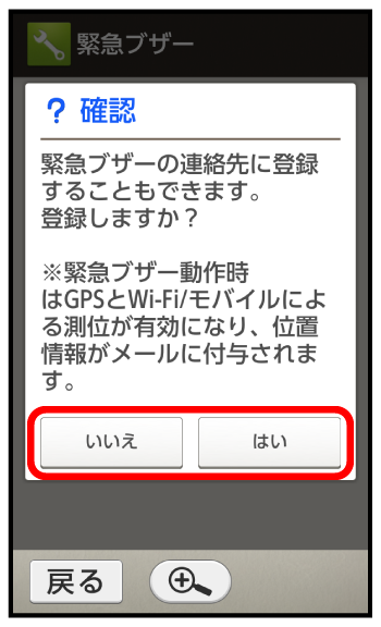 - をタップしたときは、このあと緊急ブザー連絡先の登録先(/)をタップします。