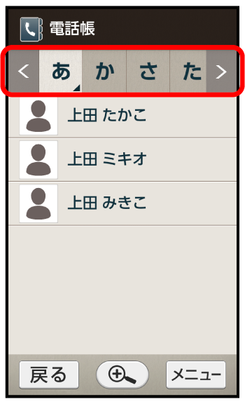 - 選択中の読みの行を再度タップすると、行内の文字(「さ行」のときは「さしすせそ」)が表示されます。文字をタップすると、その文字から始まる読みの電話帳が表示されます。