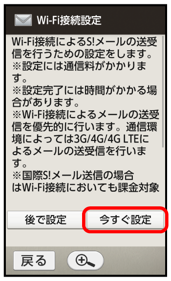 メールをはじめて起動したときは、Wi-Fi利用時にS!メールを送受信するための設定を行います。