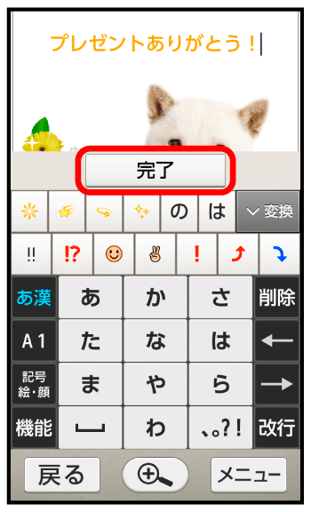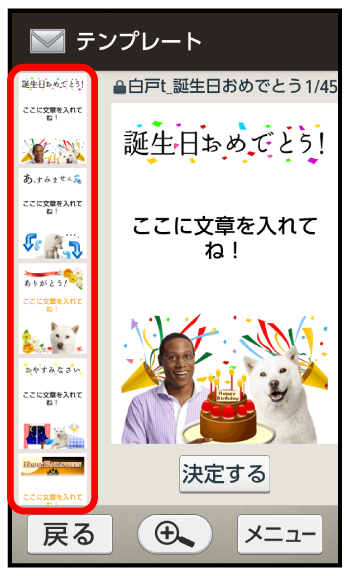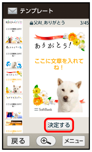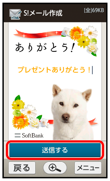 さまざまなデザインを利用して、メールを装飾することができます。ここでは、S!メールの送受信履歴を利用して送信する方法を例に説明します。