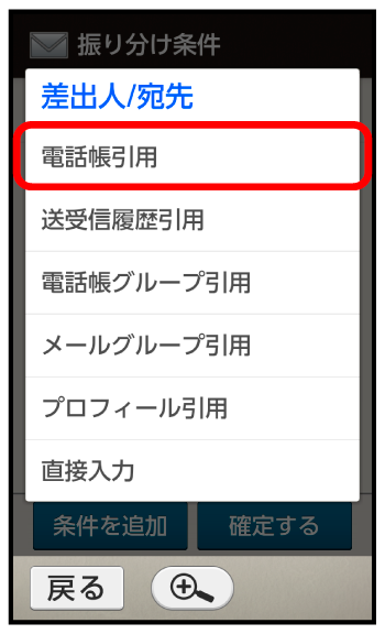受信メールを差出人のアドレス(電話帳引用)で振り分ける設定を例に説明します。