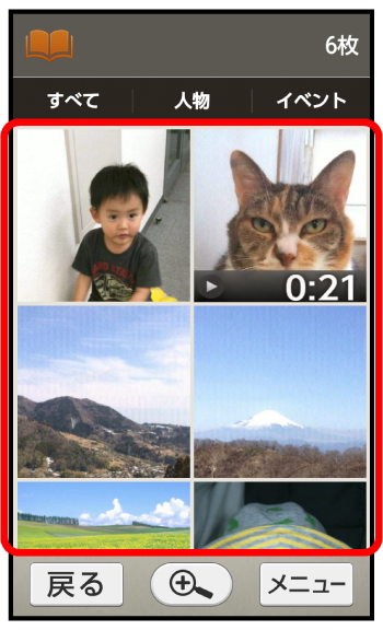 画像一覧画面上部の、、は画像が分類されているカテゴリです。カテゴリをタップすると、カテゴリに分類されている静止画/動画が表示できます。