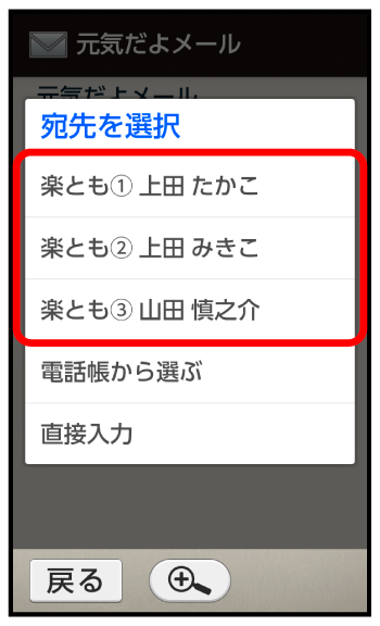 - 登録する相手は、楽ともリンクや電話帳に登録しておくと便利です。ここでは、楽ともリンクに登録済みの相手を、送信相手に登録する操作を例に説明します(この場合は、必ず楽ともリンクの「メール宛先アドレス」を登録しておいてください)。