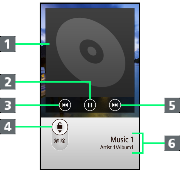 を押すと画面が点灯し、ウェルカムシート(ロック画面)に曲操作パネルが表示されます。