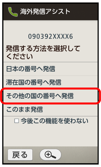 ダイヤルボタンをタップして相手の電話番号を入力海外発信アシスト画面が表示されます。