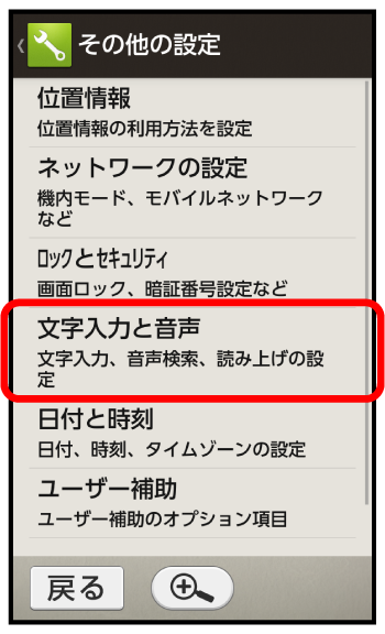 文字入力と音声の設定画面で入力方法をタップ- をタップすると、入力方法の動作が設定できます。